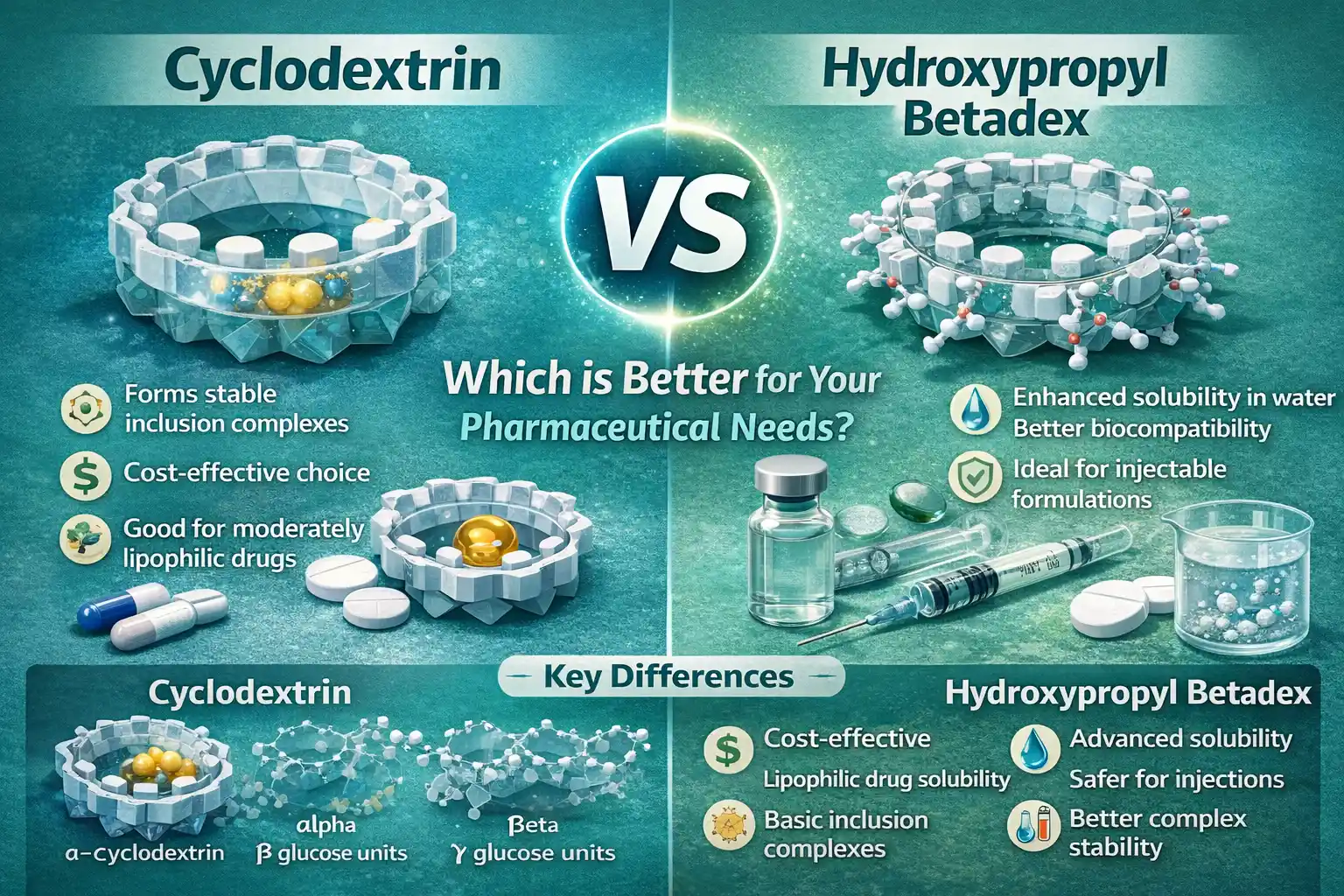 Када је у питању фармацеутска употреба, циклодекстрин ихидроксипропил бетадексоба су добра за методе испоруке лекова на свој начин. Стандардни циклодекстрини су добри у затварању молекула и исплативи су. С друге стране, хидроксипропил бетадекс се боље раствара у води и биокомпатибилнији је. Избор зависи од потреба ваше формулације, са хидроксипропил бетадексом који обезбеђује напредно побољшање растворљивости за тешке молекуле лекова и циклодекстрине који се истичу у базичним инклузивним комплексима.