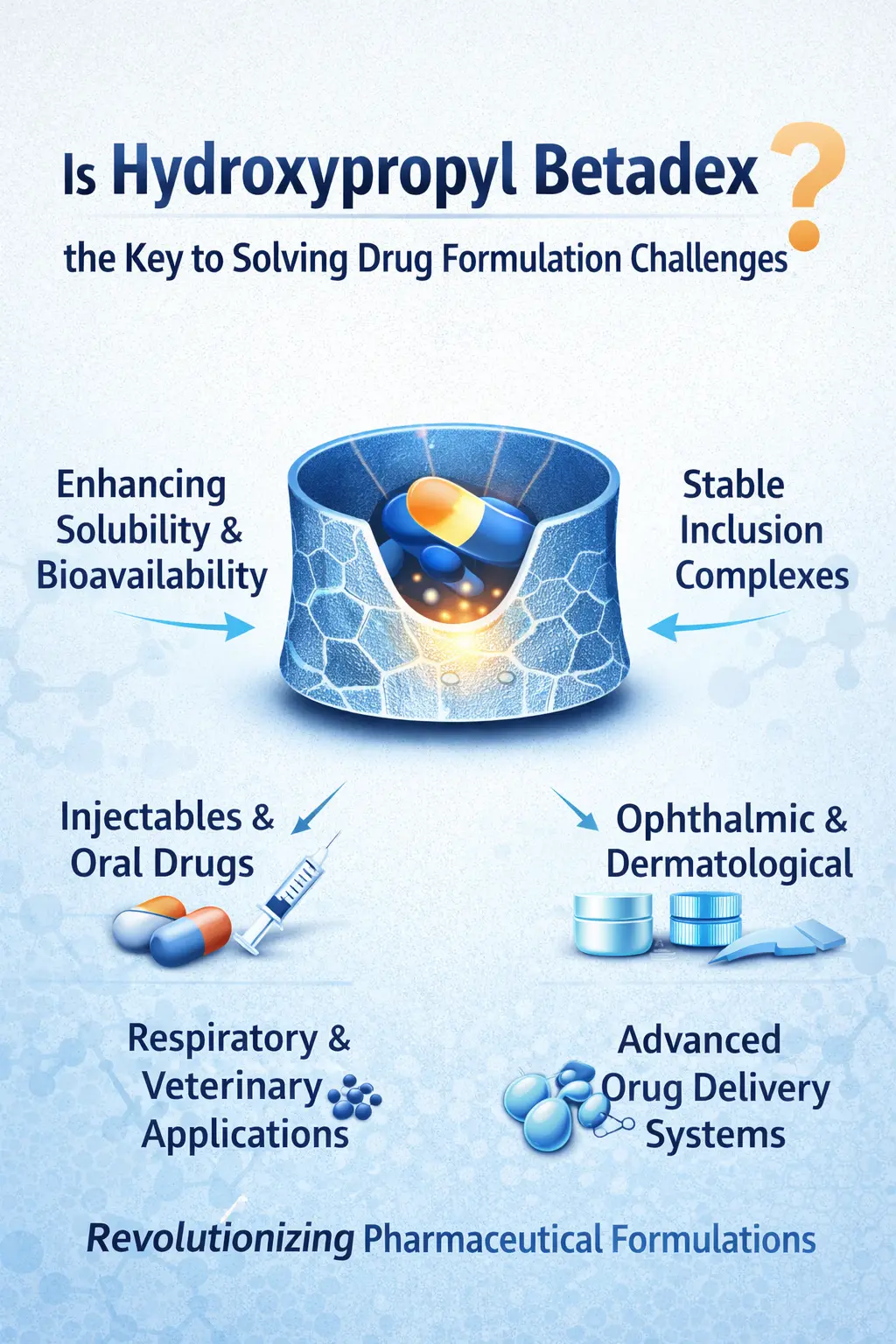 Проблеми са растворљивошћу и безбедношћу лекова су уобичајени код лекова за ињекције.Хидроксипропил Бетадексрешава ове проблеме стварањем стабилних инклузивних комплекса који одржавају чистоћу лека док се чува и даје. Хемикалија омогућава претварање супстанци које су раније биле проблематичне у бистре, безбедне течне растворе.